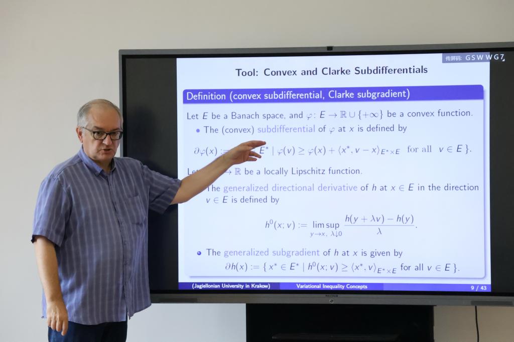 Migorski教授主要从变分不等式的主要公式以及变分和半变分不等式的应用这两个方面进行报告。首先,他通过介绍相关的数学工具和列举例子,给出了变分-半变分不等式的相关结果,并引出椭圆变分-半变分不等式的定义。同时,Migorski教授详细证明了椭圆变分-半变分不等式定义的良定义性,并通过惩罚方法证明了模型的存在性。最后,Migorski教授用通俗易懂的语言讲解了变分和半变分不等式在接触力学、半透膜和地震现象等方面上的应用。