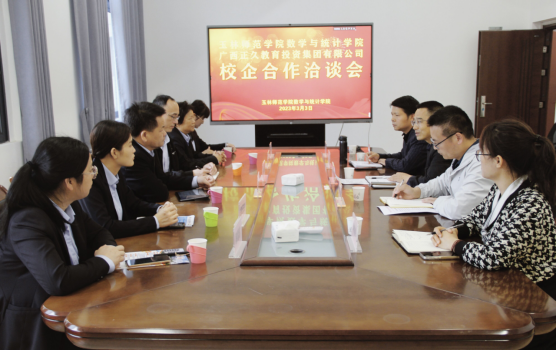 3月3日下午,广西正久教育投资集团有限公司董事长陈斌礼一行到EMC易倍开展校企深度合作洽谈。数学与统计公司党委书记庞伟、副经理王培(主持全面行政工作)、副经理杨京开等领导老师参加座谈,会议由王培主持。