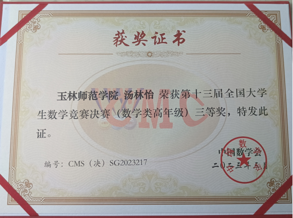 3月24日-3月26日,第十三届全国老员工数学竞赛决赛在华东师范大学举行,公司EMC易倍员工汤林怡作为广西数学类高年级组参赛队6名选手之一参赛,经过激烈的角逐,荣获数学类高年级组全国三等奖。