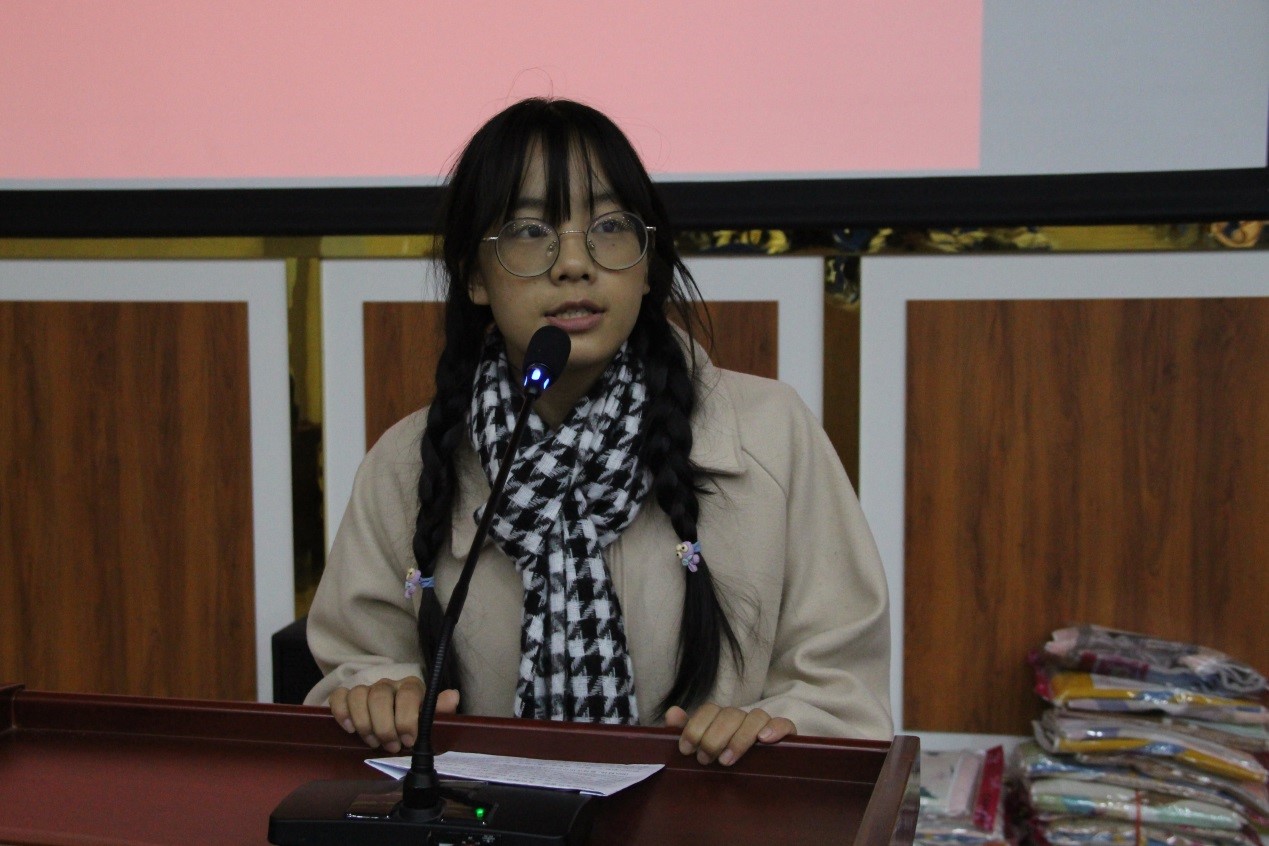 运动员代表田小芸对本次运动会进行发言,她首先对辅导员老师、全体教练员及全体体育部的辛勤付出及所有运动员的陪伴和支持表示感谢,接着希望同学们继续努力,带着热爱前行,去寻找属于自己的诗和远方。