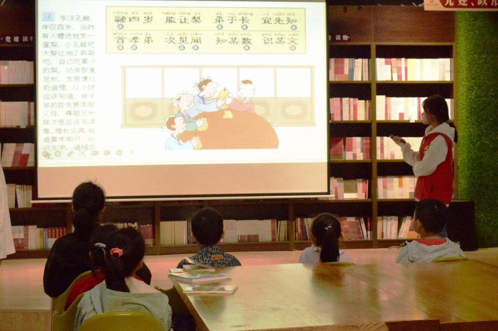 为引导未成年人学习传统文化的深刻道理和礼仪教育,志愿者在教室中进行《三字经》讲解课程,向社区的小朋友们讲解有关忠、义、礼、孝等的优秀传统文化,并结合历史故事和视频生动地展现中华传统文化的精髓。讲解过程中,小朋友们认真听志愿者讲课并积极回应。